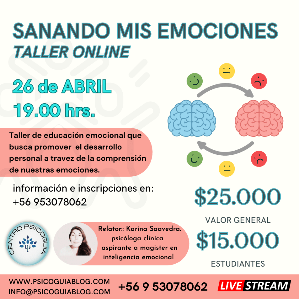 Ven a Sanar tus Emociones el 26 de Abril! Este taller te ayudará a comprender mejor tus sentimientos y a encontrar mecanismos para abordarlos. Aprende como conectar profundamente con tus emociones para poder curarlas y liberarlas. ¡No te quedes sin tu lugar!