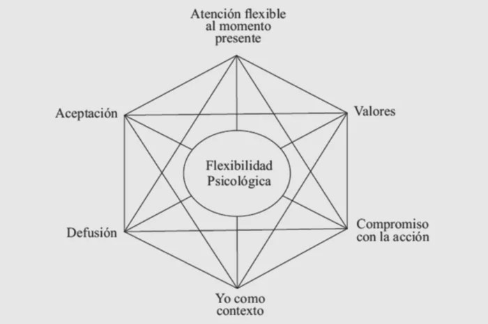 El hexágono de ACT incluye los seis procesos esenciales que estructuran la terapia: conciencia de sí, aceptación, observación, valores, acción y persistencia. Estos procesos se enfocan en fortalecer la flexibilidad mental y la aceptación de los cambios. La conciencia de sí se refiere al desarrollo de una mayor comprensión de uno mismo y de los propios pensamientos y emociones. La aceptación se refiere a permitir que los pensamientos y emociones existan sin juzgarlos. La observación se refiere a la habilidad de desarrollar una perspectiva objetiva sobre uno mismo y la realidad. Los valores se refieren a la identificación de los propios objetivos y metas. La acción se refiere al compromiso de actuar de acuerdo con los valores identificados. Y la persistencia se refiere a la capacidad de perseguir los objetivos en la cara de los desafíos. La flexibilidad psicológica es una herramienta poderosa para promover el bienestar mental y emocional. Esta habilidad permite a las personas adaptarse de manera adaptativa a los cambios, en lugar de ser paralizados por el estrés y la ansiedad. Un estudio realizado por los profesores de la Universidad de Nueva York, Robert A. Neimeyer y Joshua L. Hook, encontró que la flexibilidad psicológica es una herramienta esencial para el bienestar psicológico y la resiliencia. El estudio también sugiere que la flexibilidad psicológica se puede desarrollar a través del entrenamiento y práctica (Neimeyer & Hook, 2016). La flexibilidad psicológica también es una habilidad útil para afrontar el estrés. Un estudio realizado por los profesores de la Universidad de Colorado, K. V. Petrides y A. Furnham, encontró que la flexibilidad psicológica se correlacionó con una mejor regulación emocional y una menor susceptibilidad al estrés (Petrides & Furnham, 2003). Esto sugiere que el desarrollo de la flexibilidad psicológica puede ayudar a las personas a lidiar con el estrés de manera efectiva. En conclusión, la flexibilidad psicológica es un modelo de salud mental que busca promover el bienestar psicológico y emocional de un individuo. Esta perspectiva se relaciona con el hexágono de la terapia de aceptación y compromiso (ACT). Esta herramienta incluye seis procesos esenciales que estructuran la terapia: conciencia de sí, aceptación, observación, valores, acción y persistencia. Estos procesos se enfocan en fortalecer la flexibilidad mental y la aceptación de los cambios. Además, la flexibilidad psicológica se ha relacionado con una mejor regulación emocional y una menor susceptibilidad al estrés. Esto sugiere que el desarrollo de la flexibilidad psicológica puede ayudar a las personas a lidiar con el estrés de manera efectiva. En palabras de Neimeyer y Hook (2016): «La flexibilidad psicológica es una habilidad clave para promover el bienestar psicológico y emocional». Y según Petrides y Furnham (2003): «La flexibilidad psicológica se correlacionó con una mejor regulación emocional y una menor susceptibilidad al estrés». Esto demuestra que la flexibilidad psicológica es una herramienta importante para promover el bienestar mental y emocional.